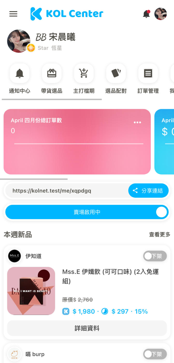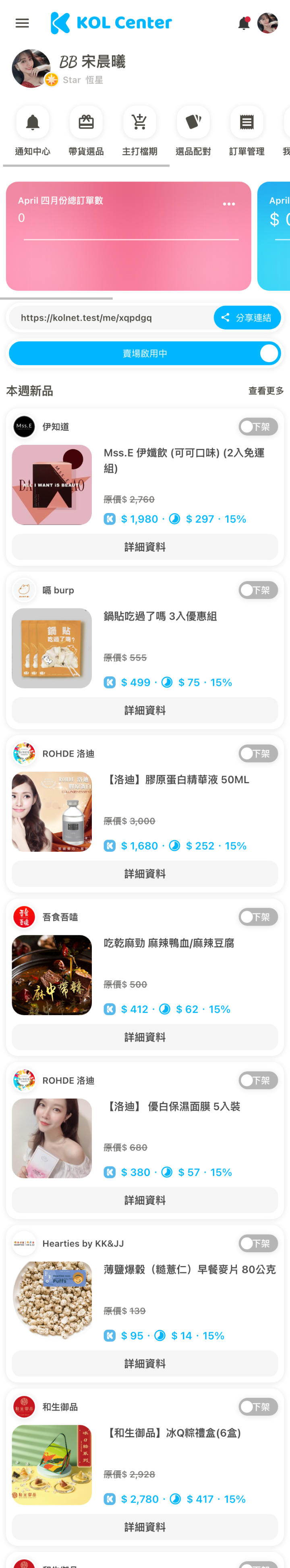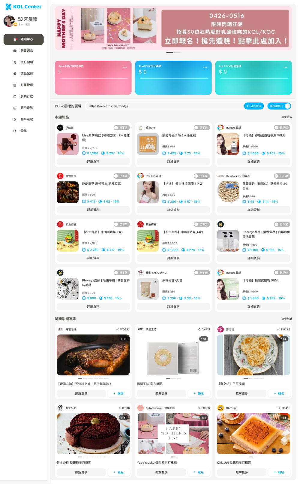 KOL Center 為您提供琳瑯滿目的商品,讓您輕鬆挑選心儀之選。無論是潮流時尚、美妝護膚、家居生活、科技產品或美食佳餚,我們都有豐富的品類等您發掘。在 KOL Center,您將體驗到精挑細選的樂趣,並將所選商品帶給您的粉絲和觀眾,讓他們共享您的好品味!